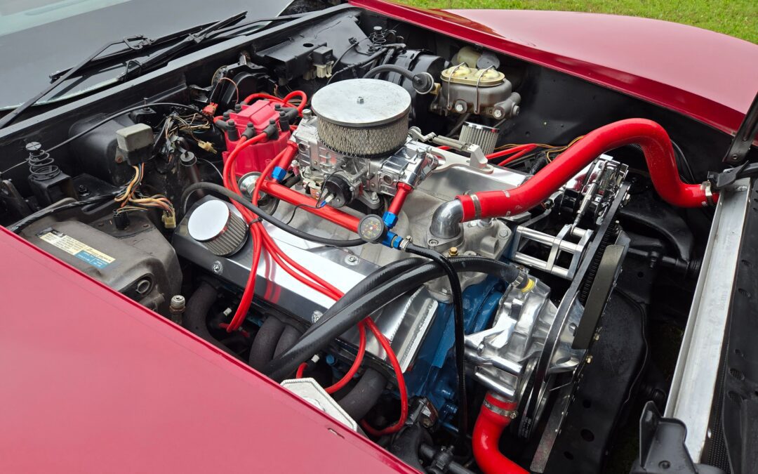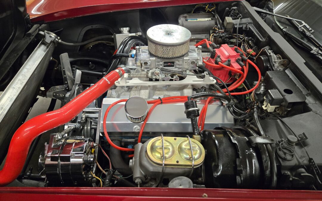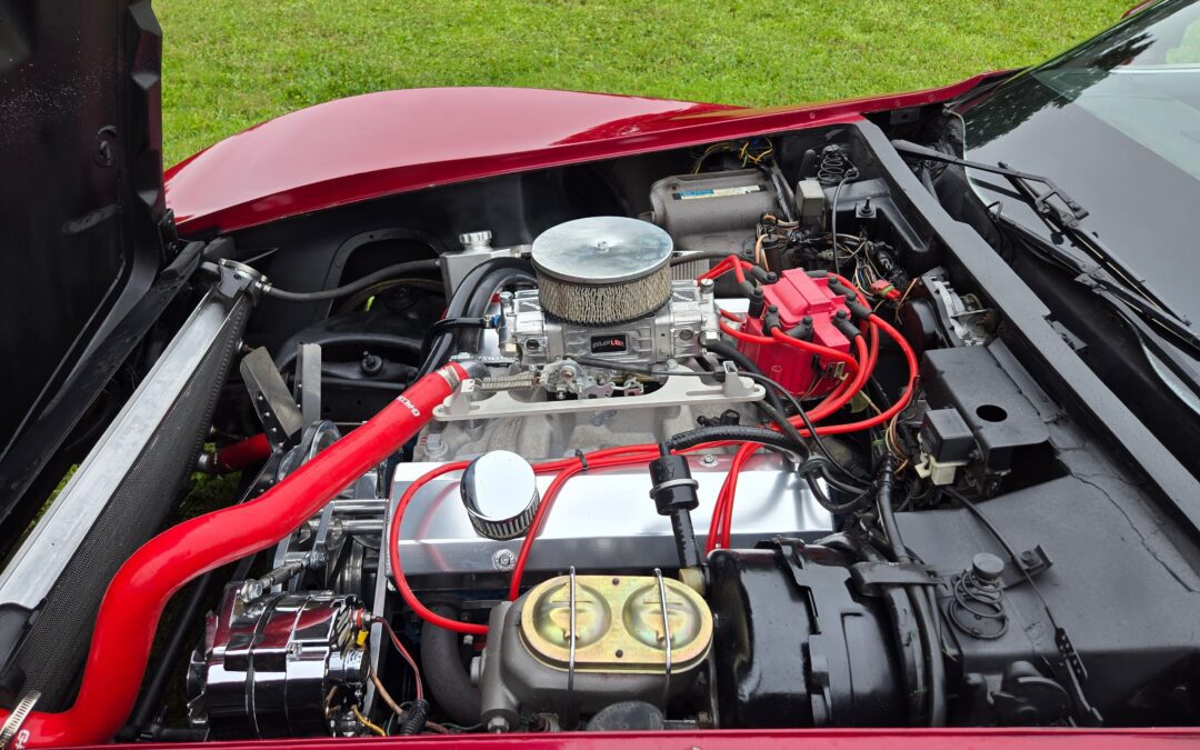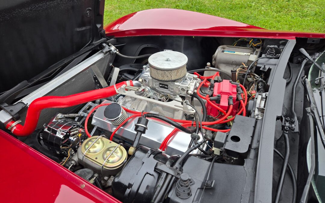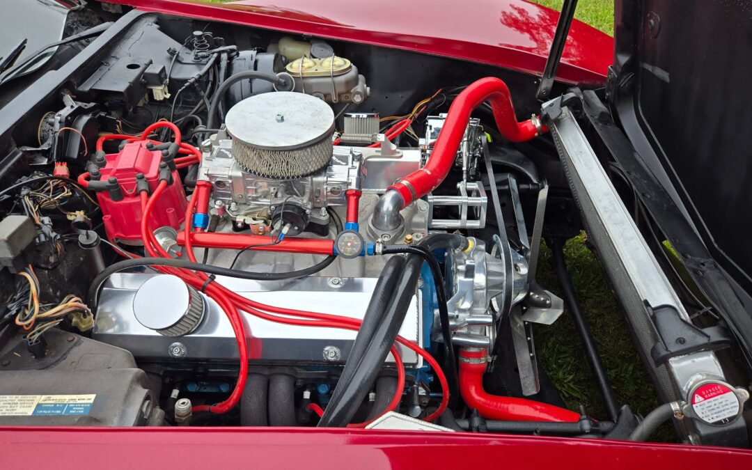 The previous owner repainted the corvette in base coat clear coat, he also installed headers, dual exhaust, Edelbrock aluminum intake, Brawler carburetor, and much more.